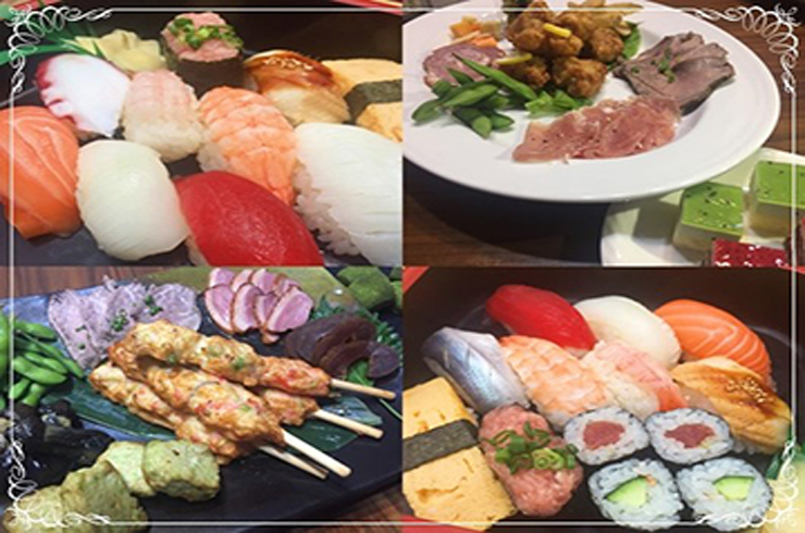 ・フロンティア特製シーフードプラッター ・2種のピンチョス ・生ハムのオリーブ添え ・ワンスプーンとグラスボウルサラダ ・特製ローストビーフ 香味ソース ・地鶏の2色ソース フォアグラ添え ・ポテトグラタン ベシャメルソース ・握り寿司 ・細巻き寿司 ・デニッシュミックスサンドウィッチ ・プチフール ・シーズンフルーツ